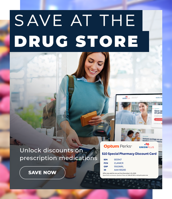 Union members can enjoy $10 OFF* their next Rx at participating network pharmacies through the Union Plus prescription discount program. Show this coupon at the counter and your discount will automatically be applied at checkout. Valid: December 1–31, 2025.