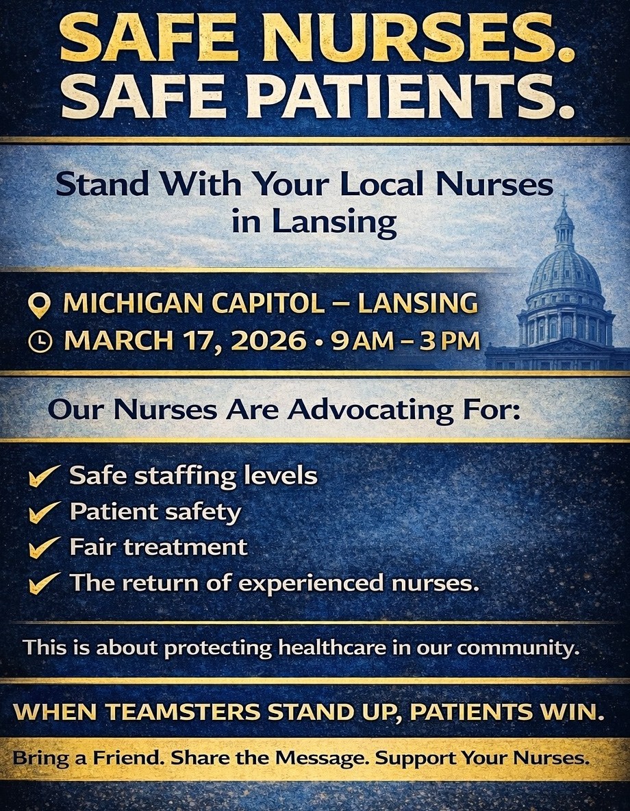 The Teamsters Local 332 nurses at Henry Ford Genesys and supporters are holding a rally at the Capitol building in Lansing, Michigan from 9:00am to 3:00pm on Tuesday, March 17.