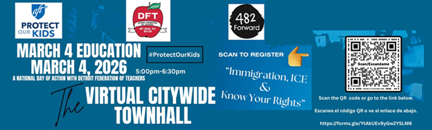 Join the Detroit Federation of Teachers on March 4 for our Virtual Citywide Townhall: “Immigration, ICE, and Know Your Rights.” This conversation will bring together diverse panelists: immigration attorneys, lawmakers, educators, parents, and community leaders to provide accurate information, clarify rights, and answer pressing questions impacting our students and families. Together, we will share resources, discuss protections, and ensure our community feels informed, empowered, and supported during these uncertain times.